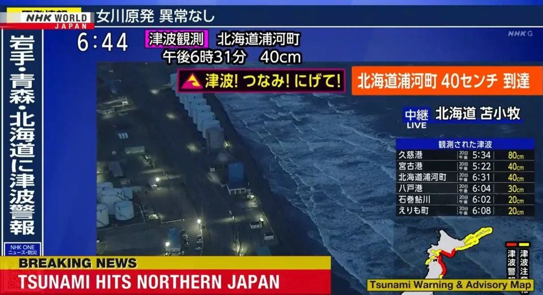 Prema podacima Japan Meteorological Agency, prvi talasi koji su pogodili obalu zasad nisu dostigli maksimalno očekivane visine, ali situacija ostaje neizvjesna. Najviši zabilježeni val dosegnuo je oko 80 centimetara u području Kuji, dok su u drugim gradovima zabilježene nešto niže vrijednosti – u Miyako oko 40 centimetara, u Hachinohe oko 30, te u Urakawa oko 20 centimetara.