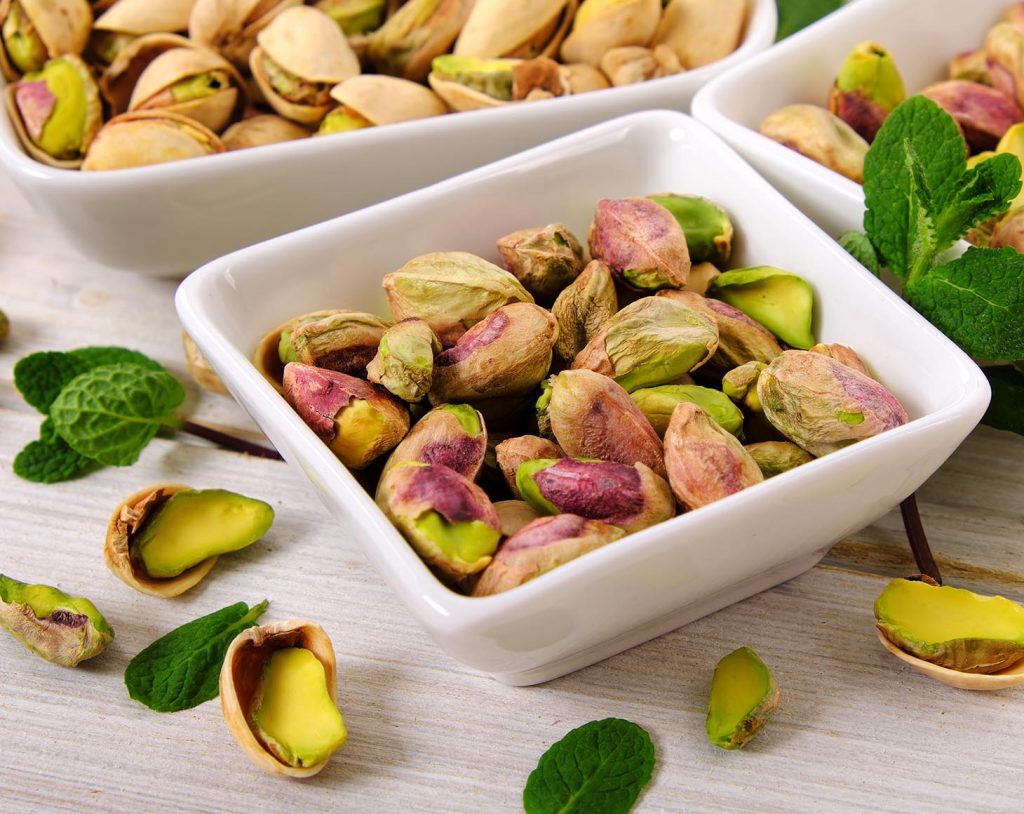Pistachios in white square bowl close up