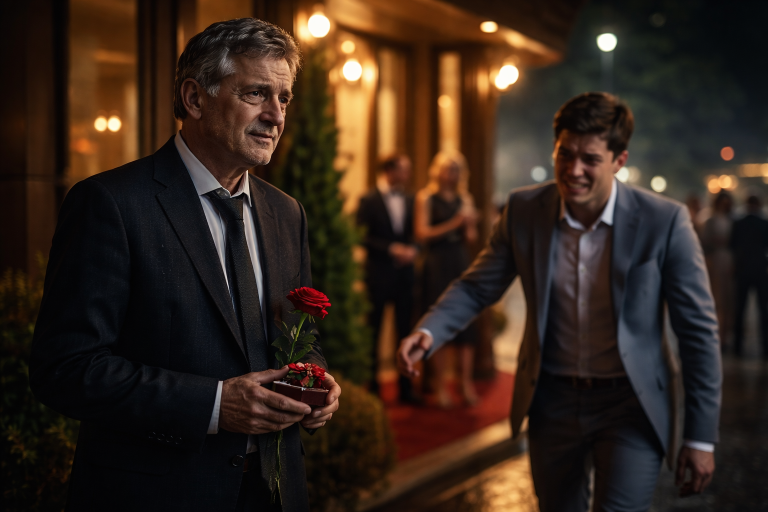 Iz taksija izlazi Gojko. Ali ovo nije bio Gojko u narandžastom odelu. Nosio je crno odelo, bijelu košulju, ispeglanu do savršenstva, a cipele sijaju. Ruke koje su nekoć držale metlu sada drže crvenu ružu i malu plišanu kutijicu. Nesigurno stoji pored taksija, tražeći pogledom svog sina, gotovo se izvinjavajući što postoji.